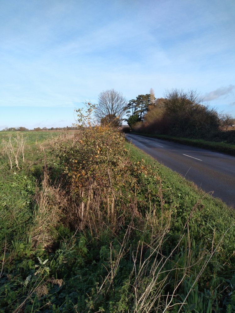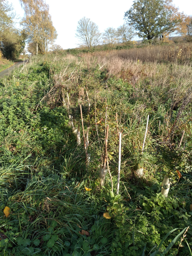 A recently planted hedge has been surveyed to plan for management in the spring. The difference in hedge height along the main road compared to quieter margins is striking and bears witness to the damage done by browsing deer where there is no traffic.